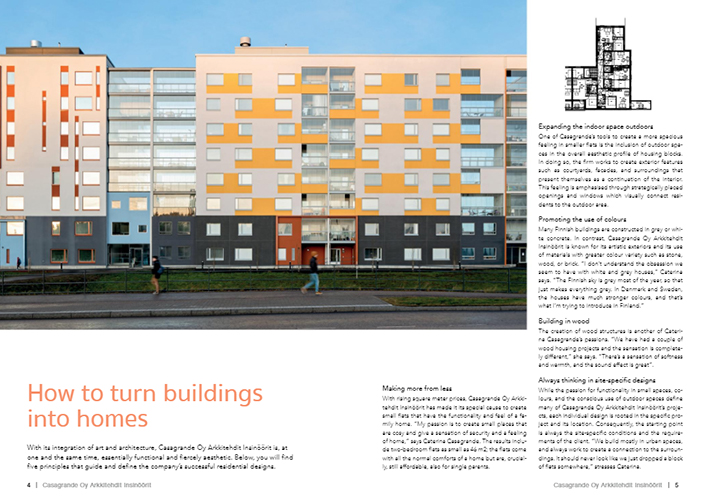 Working with the successful Finnish architecture firm Casagrande Oy Arkkitehdit Insinöörit, we produced this stylish magazine; it is defined by the strong colours of the firm’s designs and the sharp ideas of its founder, Caterina Casagrande.